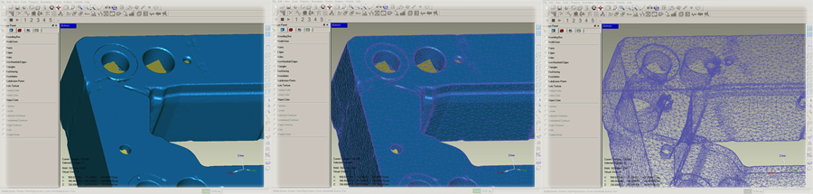 A szkennelt alkatrész 3D modellje GEOMAGICben, és az arra feszített háromszögháló