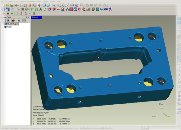 A szkennelt 3D adat feldolgozásának első fázisa a modell editálása Geomagic Studio szoftverrel. A program segítségével hibás rész kijavítható illetve befoltozhatók azok a részek, ahova a szkenner a tárgy alaksajátosságai miatt nem láthatott be. Az eljárás előkészíti a modellt mérések elvégzésére, látványtervezésre és az újratervezésre.